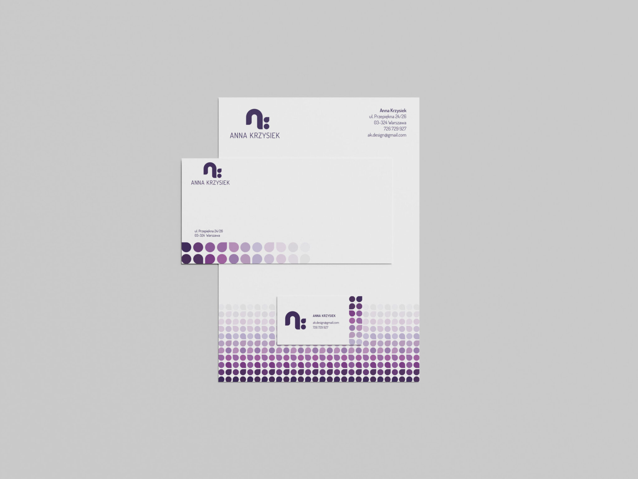 Projekt logo oraz identyfikacji wizualnej przykładowej marki ANNA KRZYSIEK. W projekcie uwzględnione zostały projekty wizytówek, papieru firmowego oraz koperty. Projekt inspirowany był kwiatami i kształtem płatków.