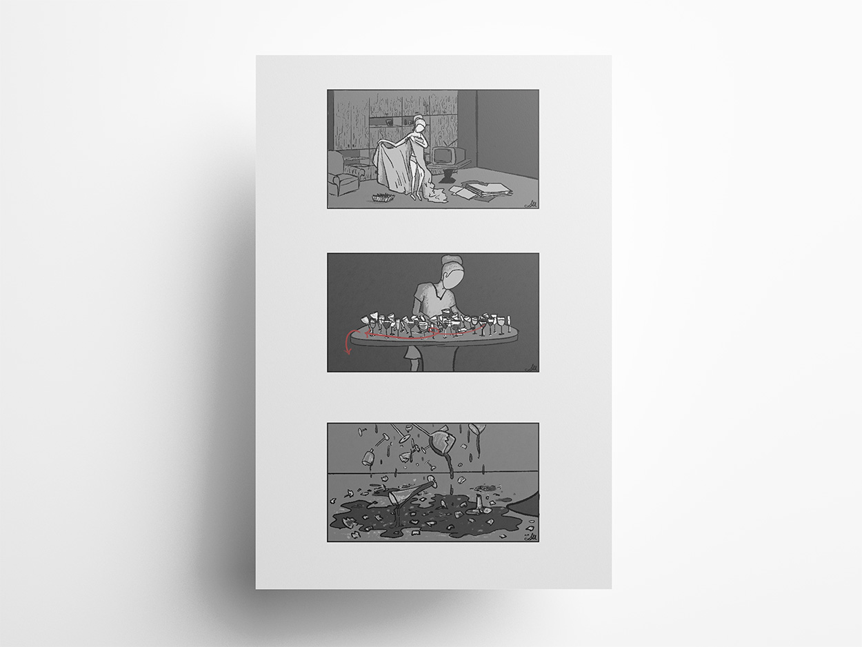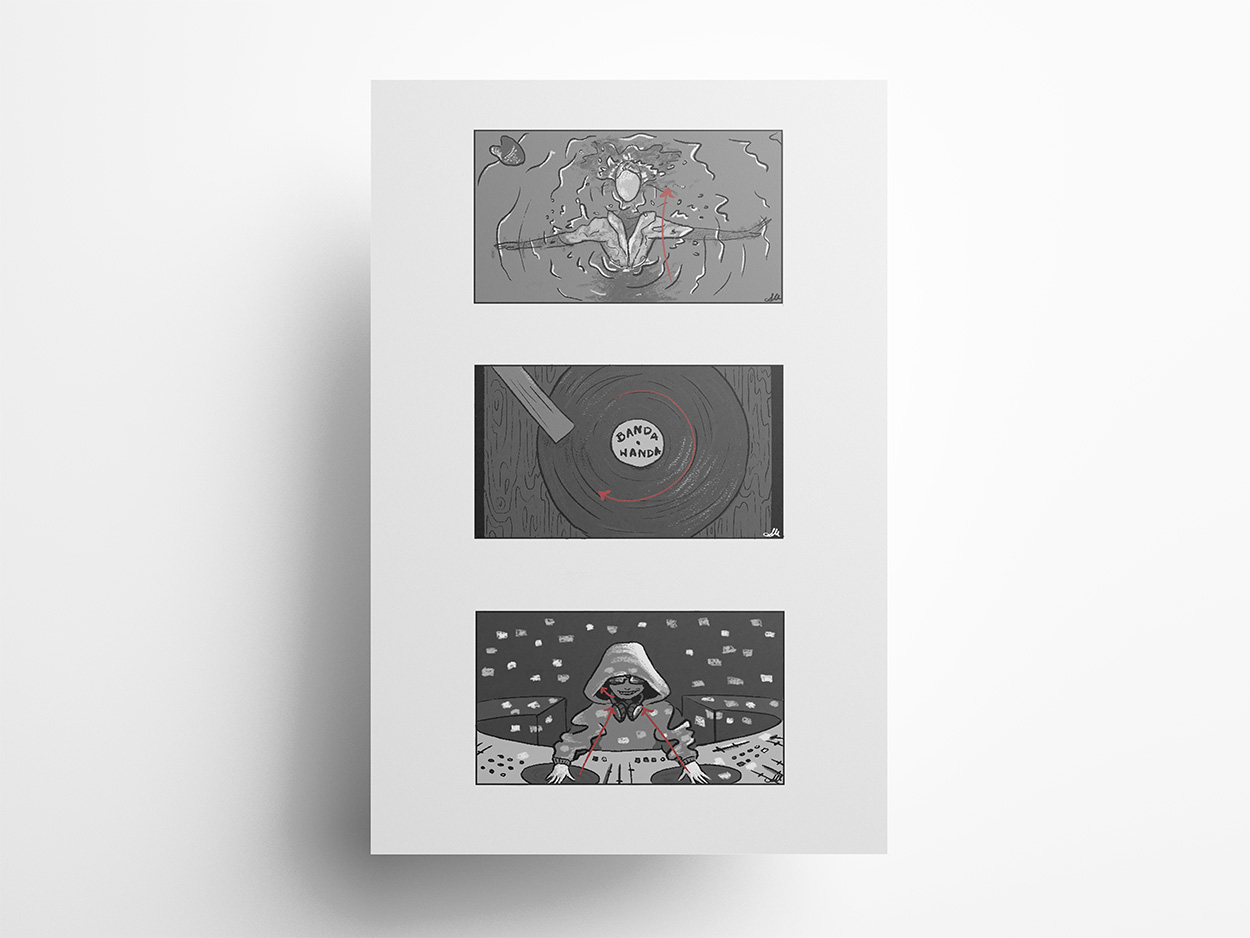 Wybrane kadry z wizualizacji storyboardu do projektu ekranizacji nieoficjalnego teledysku „HI-FI” zespołu Wanda i Banda w realizacji marki Tędy na balet.
