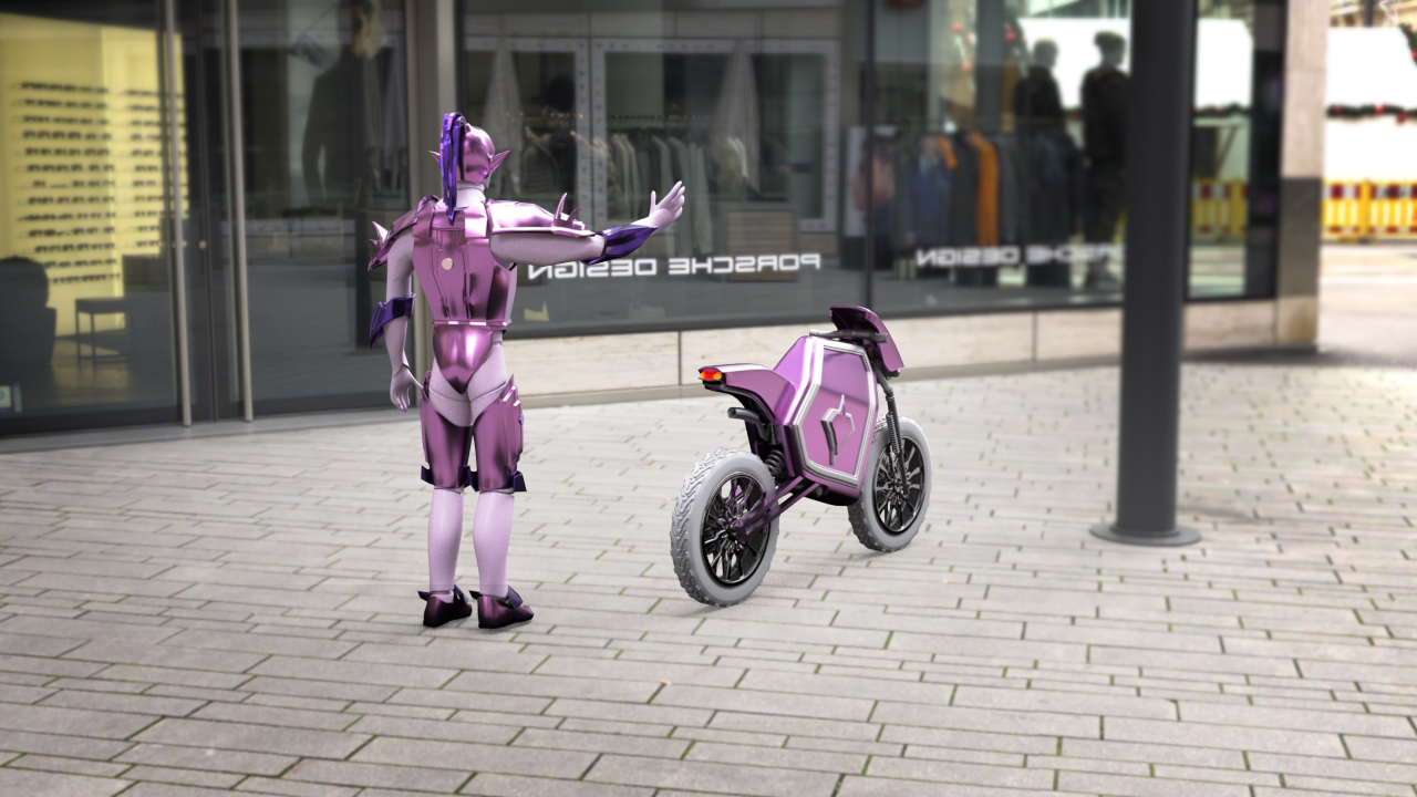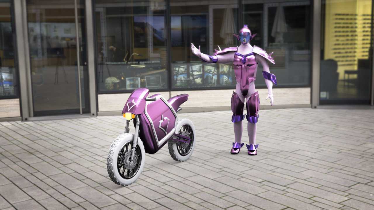 Model zbroi Power Rengera w kolorze różowym wraz z modelem jego motocykla. Projekt obejmuje hełm, naramienniki, nagolenniki, zbroję oraz buty. Projekt wykonany został w programie Autodesk 3Ds Max i wyrenderowany na silniku Arnold.