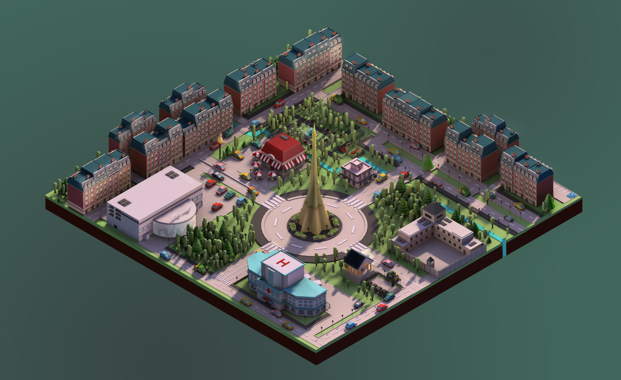 Projekt centrum miasta wykonanego w programie Cinema 4D. Miasto zostało wykonane w stylu cartoon. Wyrenderowano je przy użyciu silnika Arnold. Na renderach poniżej widoczna wersja finalna, wersja ambient occlusion oraz wersja linearna.