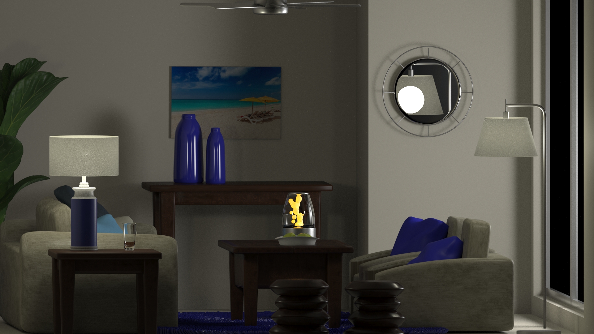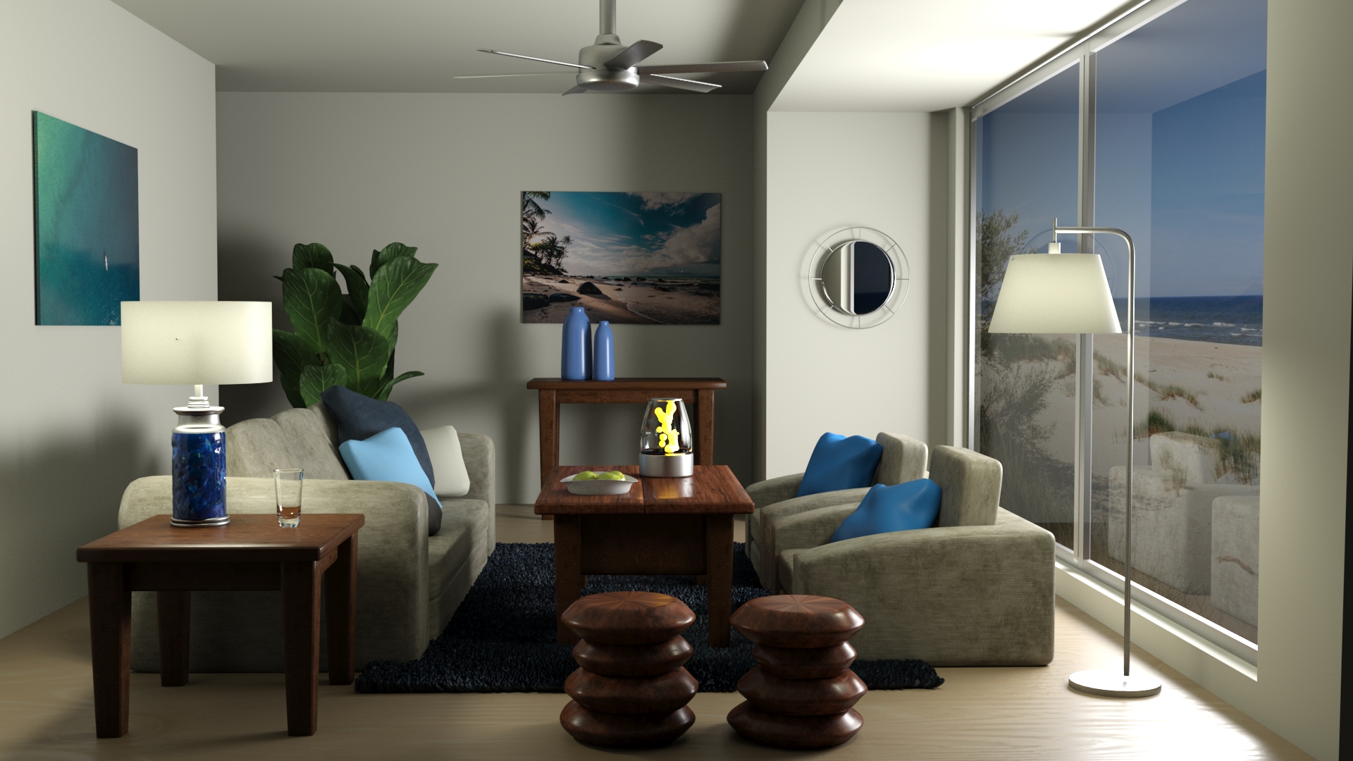 Wizualizacja salonu wykonana w programie Autodesk 3Ds Max. Wszystkie meble, akcesoria i dodatki wykonano samodzielnie. Scena została stworzona od podstaw. Kompozycja inspirowana była śródziemnomorskim stylem. Scenę wyrenderowano na silniku Arnold.